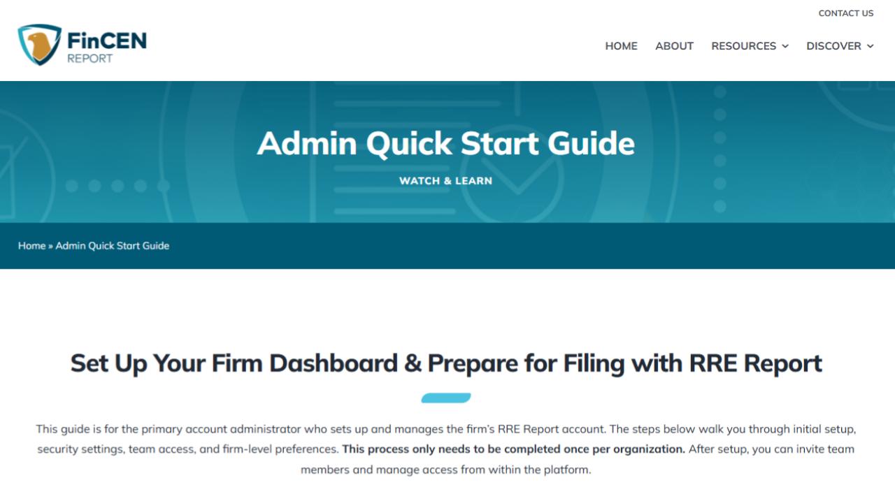 The individual responsible for setting up your organization’s RRE Report account. Once your account is activated, you can invite the rest of your team and manage firm settings from your dashboard. Use this guide if you are the primary contact creating and configuring your firm’s account.